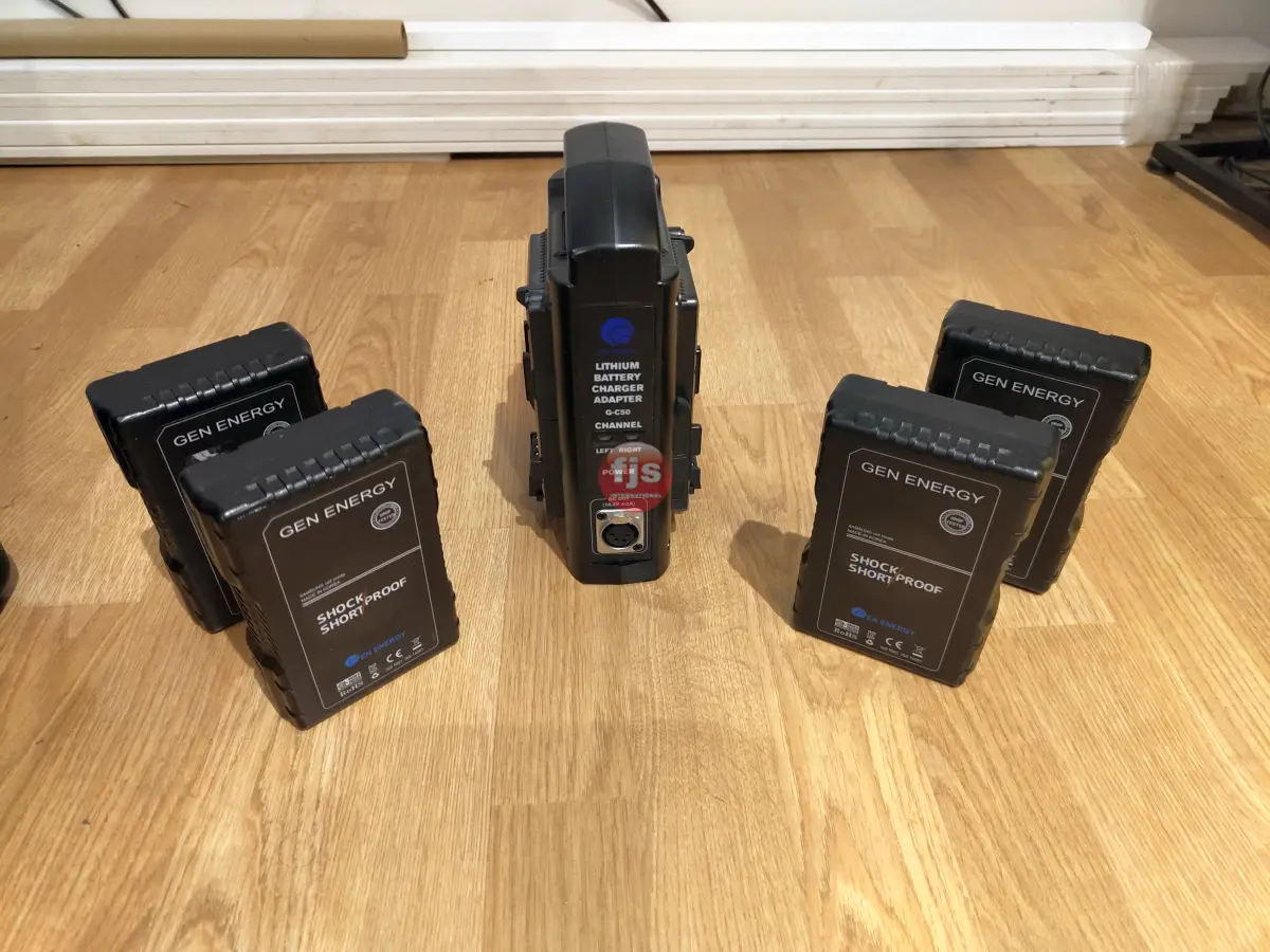 -Four IndiPRO Tools Micro-Series V-Mount Li-Ion Batteries (270Wh) with two dual chargers
